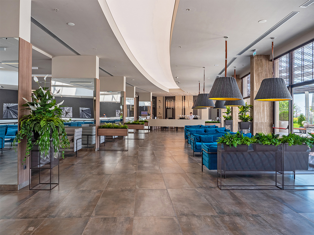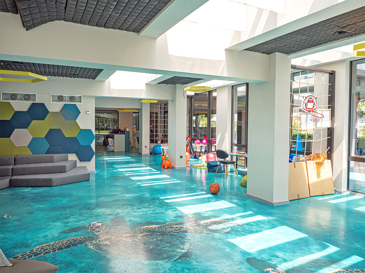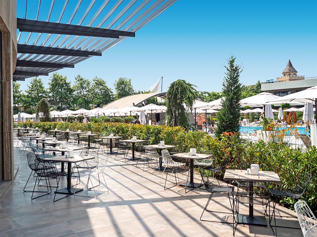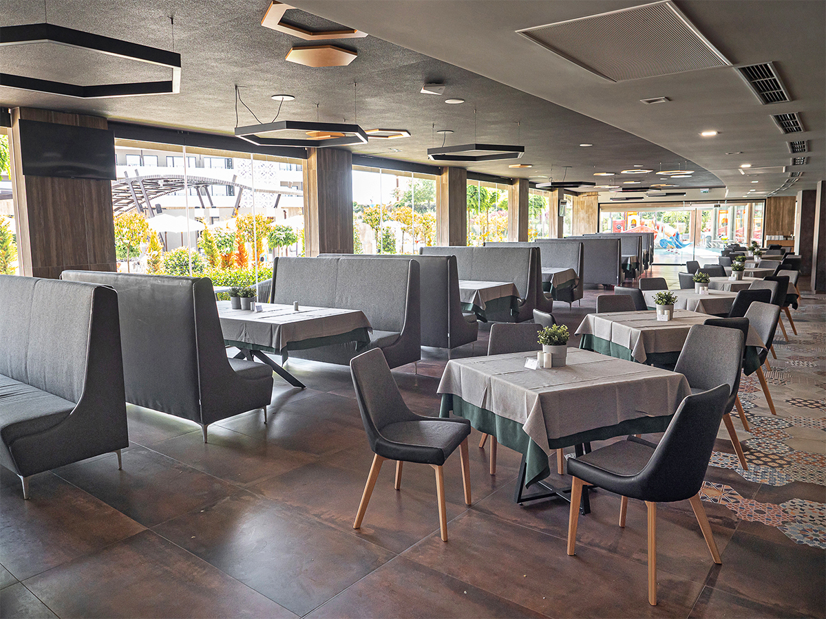 Die großzügige Anlage besteht aus drei Gebäuden und bietet viel Platz zum Entspannen und Spaßhaben. Highlight ist der große Wasserpark mit zahlreichen Rutschen und Wasserspielen, der für Kinder und Erwachsene gleichermaßen ein echtes Erlebnis ist. Zusätzlich stehen mehrere Pools, ein Kinderbecken, Whirlpools und Sonnenterrassen zur Verfügung.