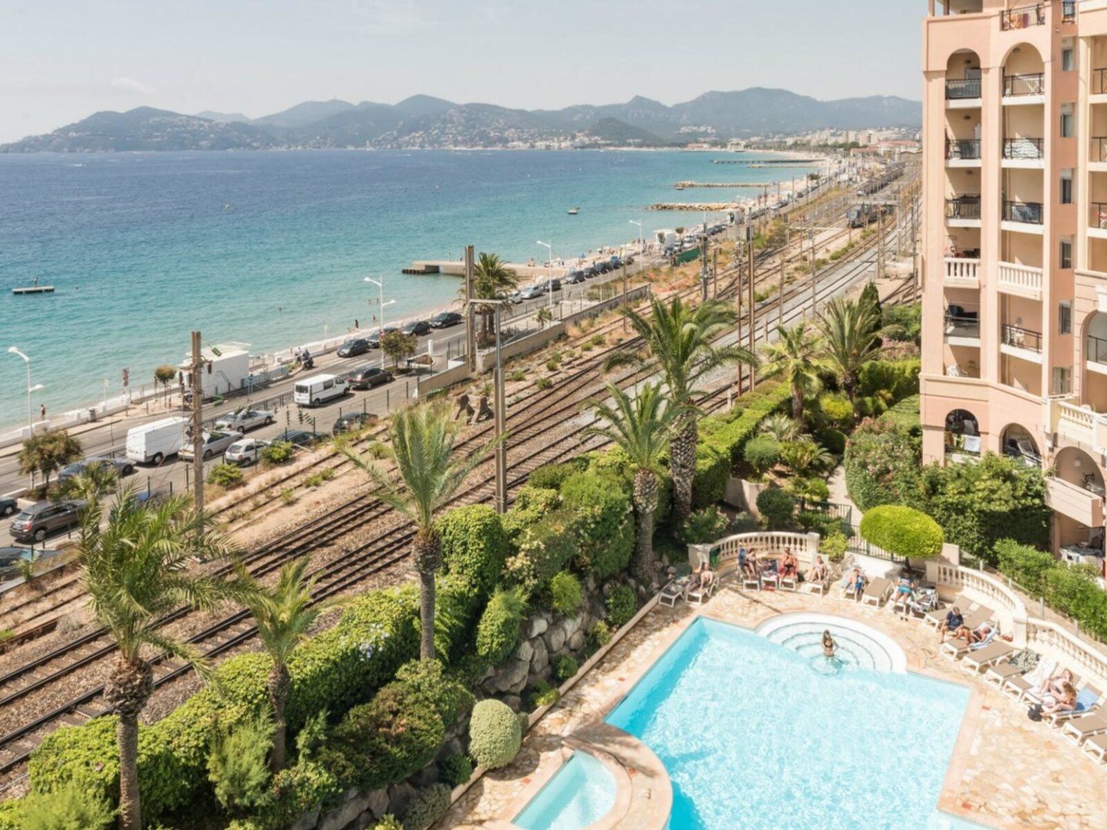 Ruhige Résidence in Cannes, nur 50 Meter vom Strand entfernt, mit Pools, Gartenanlage, komfortablen Apartments und traumhaften Blicken auf das Mittelmeer.