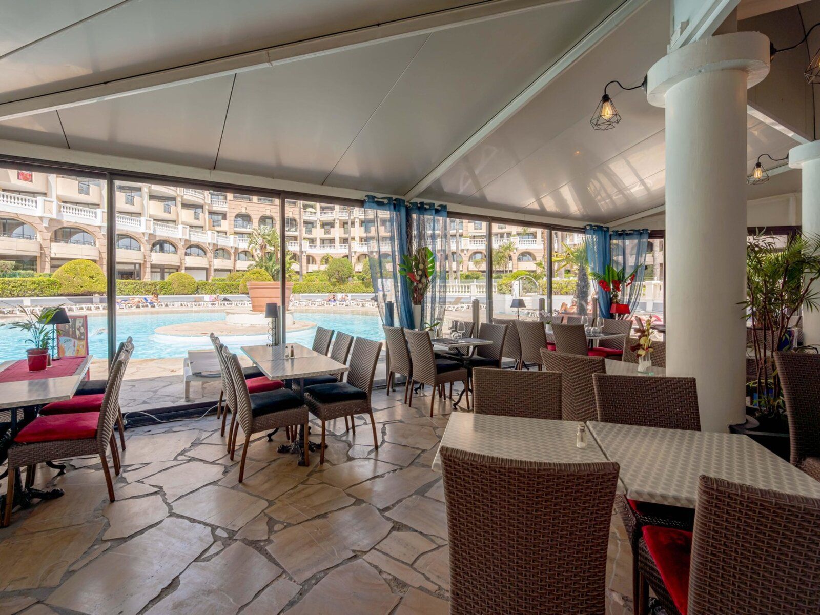 Die Rezeption ist täglich geöffnet, WLAN ist verfügbar. Parkplätze stehen nach Verfügbarkeit kostenfrei zur Verfügung. Haustiere sind auf Anfrage gegen Gebühr erlaubt. Kulinarisch verwöhnt das Restaurant „Café Bleu“ mit französischer und regionaler Küche, gegen Aufpreis.