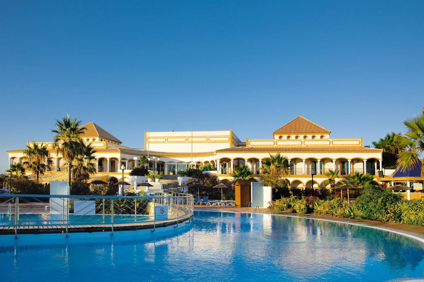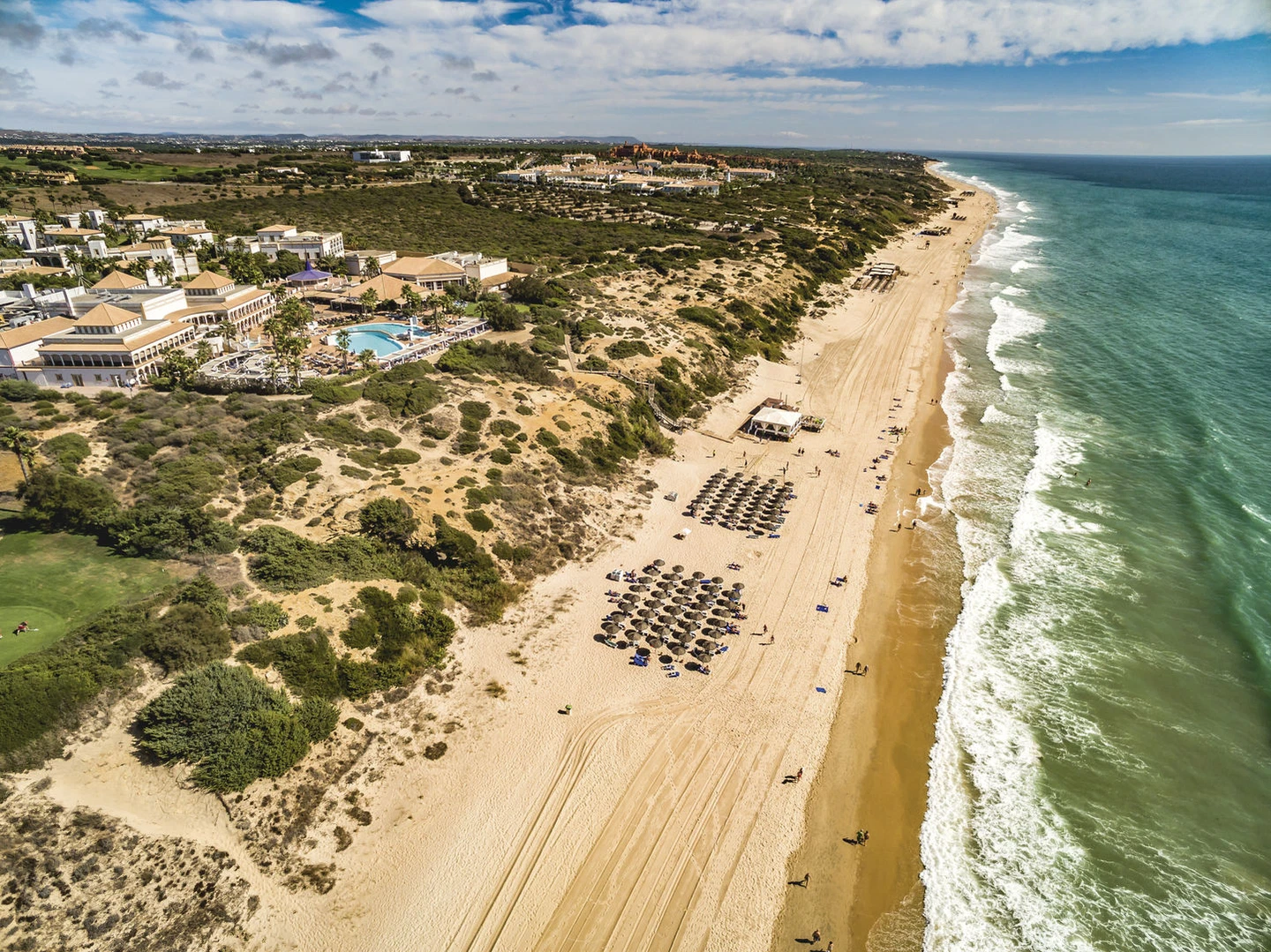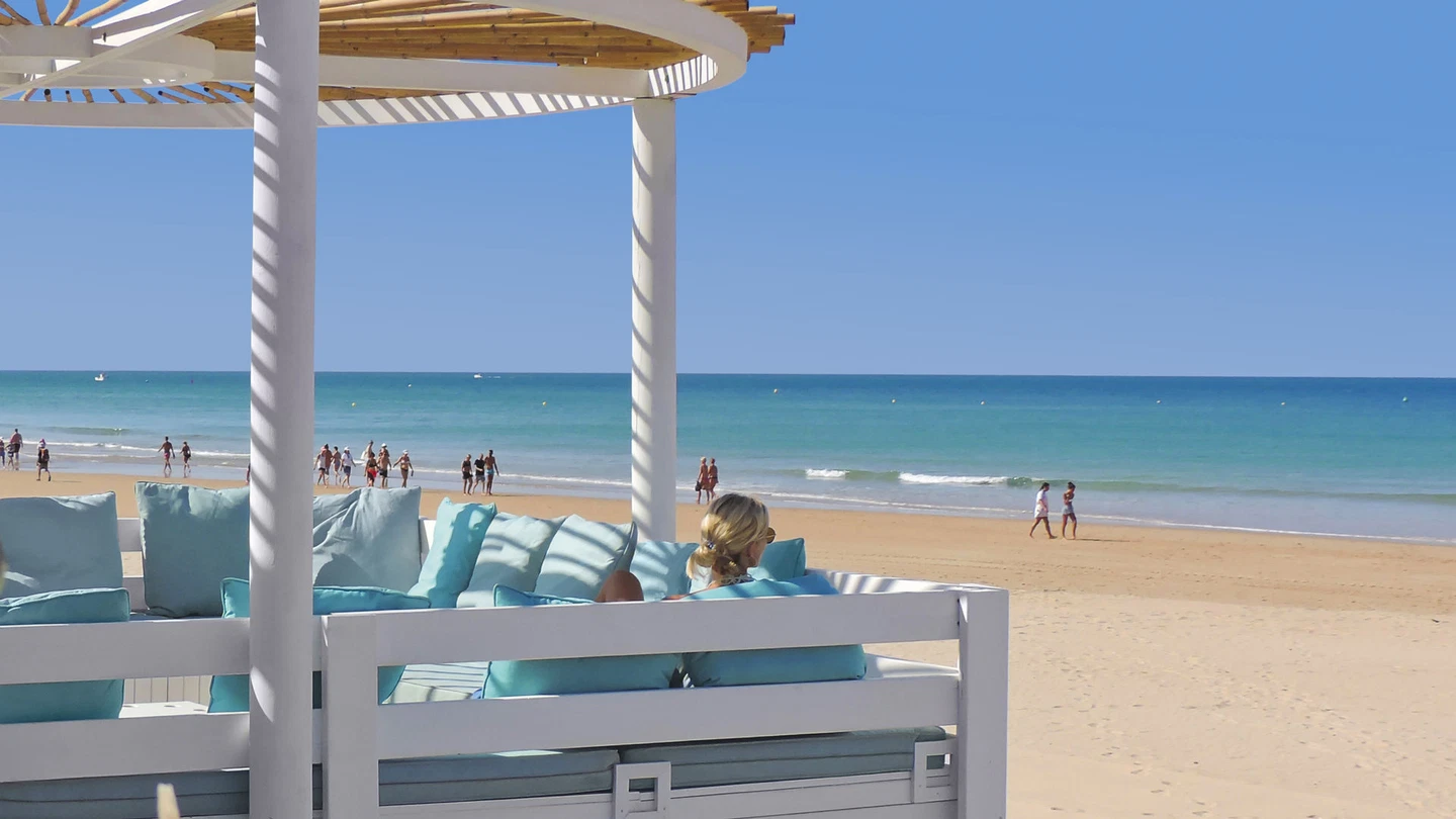 Aldiana Club Andalusia liegt direkt am kilometerlangen Sandstrand Playa la Barrosa in Novo Sancti Petri und vereint andalusischen Charme mit modernem Clubkomfort. Eingebettet zwischen Dünen, Atlantik und umliegenden Golfplätzen bietet die weitläufige Anlage mit ihren niedrigen Gebäuden und gepflegten Gartenanlagen eine entspannte Urlaubsatmosphäre für Familien und aktive Genießer.